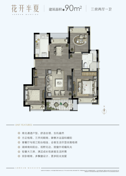用90平方米做三房,极好的控制了总价,又保证了尺度感与功能性。并且三开间朝南,南北通透,户型方正,满足成长性家庭生活所需。