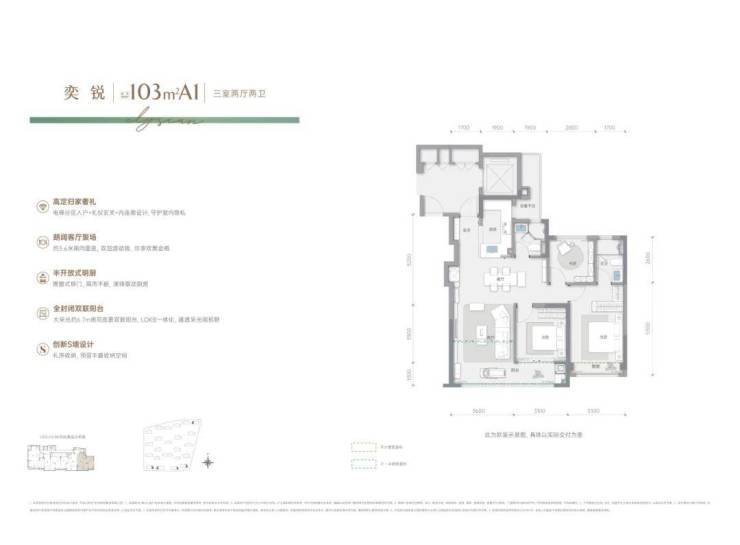建面约103㎡边套三房两卫:以“小户型大空间”的设计哲学,革新了未科改善的居住想象。户型方正,南北通透,入户独立玄关让归家充满仪式感,且几乎零浪费空间。设计上的一大亮点是全屋“应飘尽飘”的飘窗系统,大幅提升采光与景观视野,据估算全屋飘窗面积约8.5㎡,极大地提升了实际使用率。