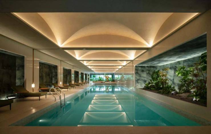 二层空间以艺术为脉络重构功能场景:专业餐酒吧搭载高端设备,化身社交艺术展厅;植物园泳池以“树影婆娑”为灵感,池底铺砌皮革面绿纹石材,营造都市秘境;女性友好健身房定制专属器械区,并配备补妆间、心理理疗室,融合健康管理与私密关怀。