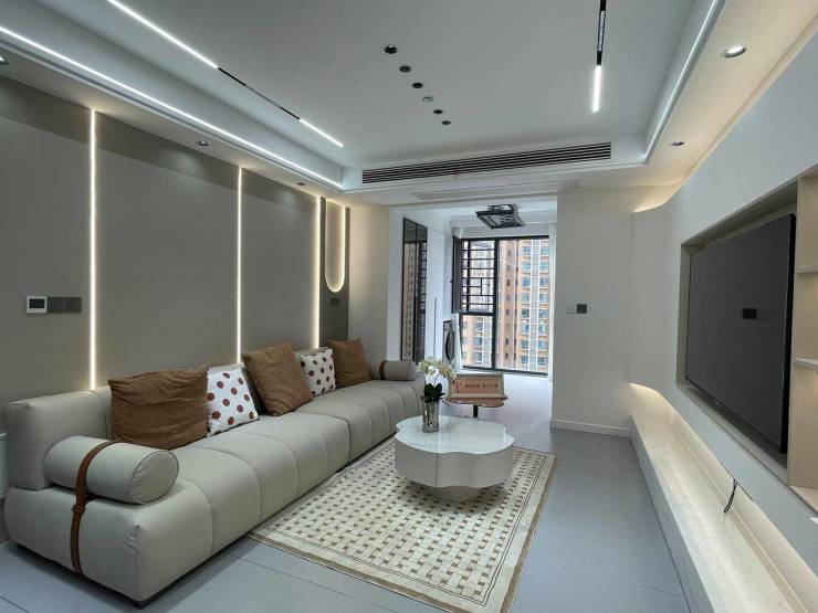客厅跟阳台打通,增加来一些室内面积,长大了室内空间,还是蛮不错的。而且顶面选择了无主灯设计,也是年轻人比较喜欢的一种款式。无主灯给人的一种感觉,简单又好看,还很时尚。家里面如果你喜欢上这样的设计,非常值得推荐。同时安装了中央空调,使用非常方便!