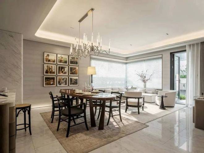 一楼,客厅到庭院是全景的落地门窗,夏日凉风习习,边套下叠还拥有全明餐厅。