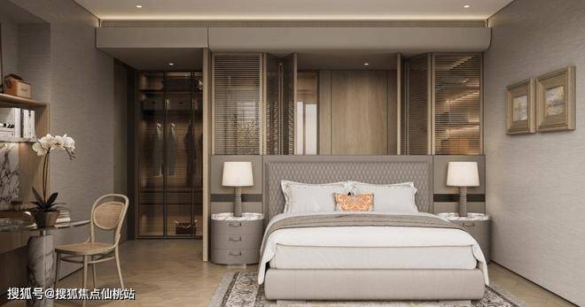 主卧套房,不仅有豪华卫浴,女王卫生间+双台盆,大尺度衣帽间,甚至书房、工作室空间就在边上,业主能体验无上的尊崇与私密。