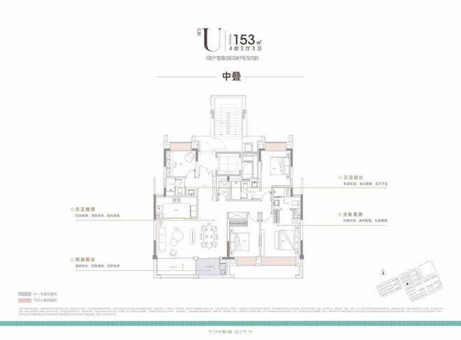 中平户型以四开间朝南的IMAX级采光面,打造出堪比市区豪宅的尺度感。4房4飘窗2阳台的设计,配合双套房布局,一共有三个套房,让每个家庭成员都享有独立私密空间。