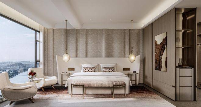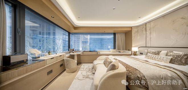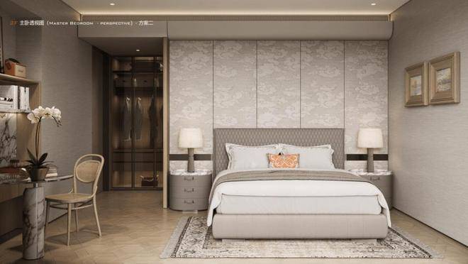 主卧拥有270度环幕飘窗,视野和采光优越,配备了高奢卫生间,空间感、尊崇感拉到顶格。