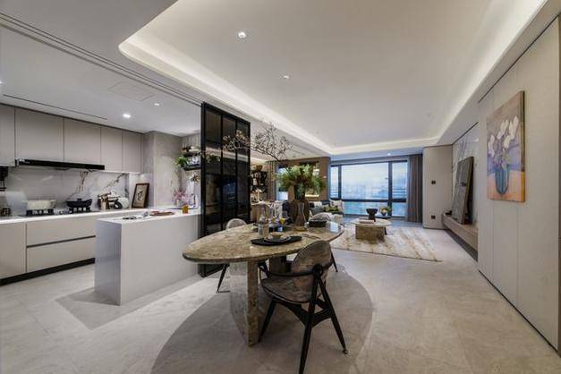建面约120㎡的大三房做了一个u型厨房,餐桌可以容纳八人餐桌,双阳台配置+加上所有飘窗都是附赠面积,整体的实用面积可想而知。