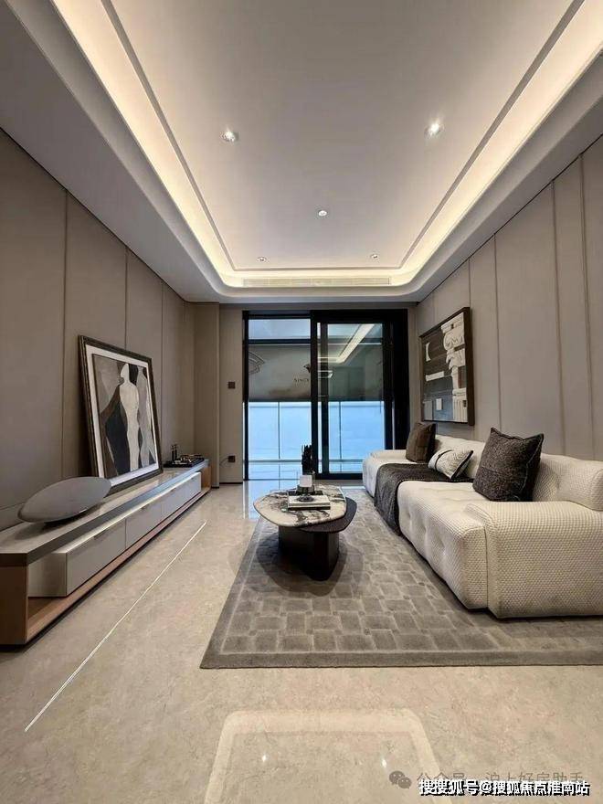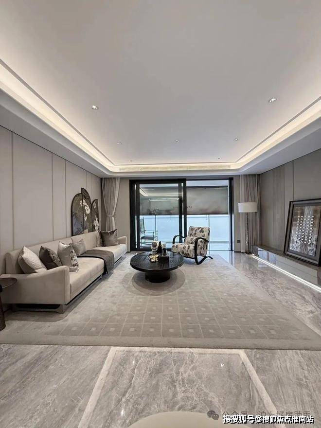 电视背景墙采用卡慕白的石材+皮革造型,弧形吊顶,相当讲究,连空调出风口的形状都打造为海上·清和玺logo山茶花的形状~~三大件为大金(或同等档次)中央空调和地暖,新风系统为百朗(或同等档次),南向阔景阳台,采光视野一级棒!