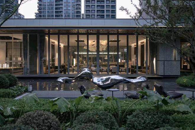 在建筑上,强调对称,突出轴线,充分传达了建筑自然、挺拔的气质。以极简的形态、“消隐”的立面设计,再配以整体平和舒缓、自然雅致的色调,呈现出不同于传统建筑的轻盈、通透质感,展现对美学的高度追求。外立面采用大面积玻璃镶嵌金属线条等现代元素,整体为银灰色系,有强烈的对称和秩序感,高级感拉满。
