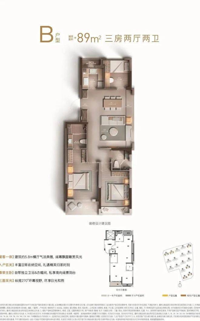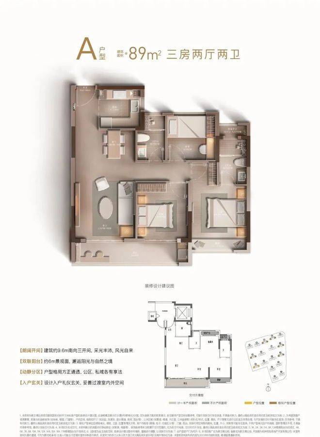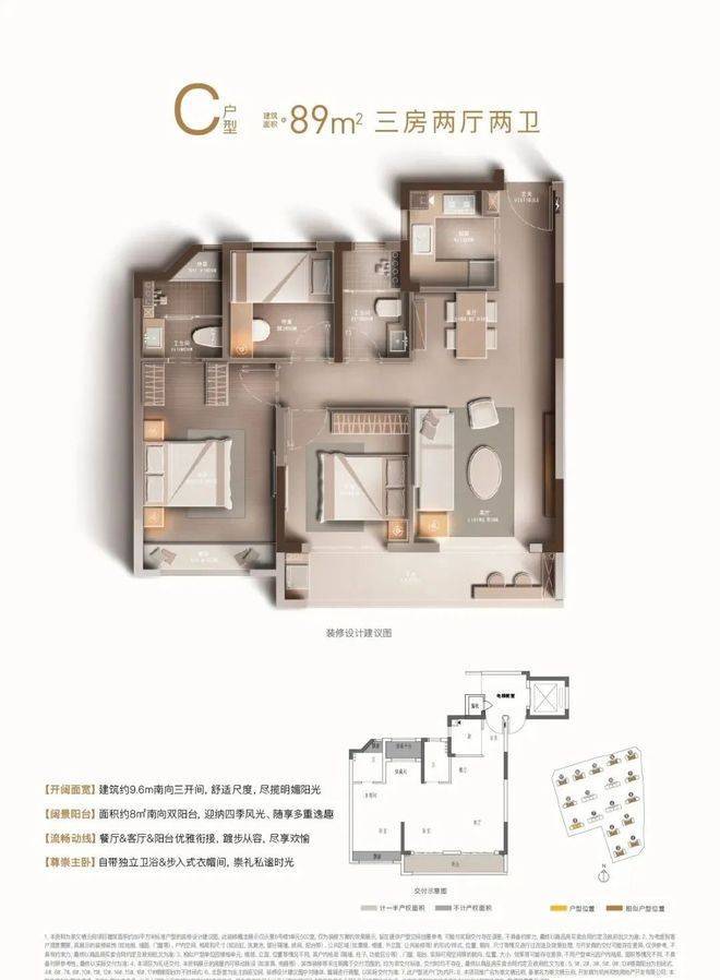 主力产品为建筑面积约89㎡户型,三房两厅两卫格局,南向三开间带宽幕双阳台,轻松容纳三口之家的温情与欢乐;建筑面积约110㎡均为边套户型,纵享丰富观景视野,四房两厅两卫设计并蓄尺度感与尊崇感。