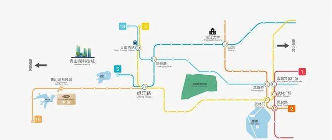 地铁16号线:直距约300m即「青山湖科技城站」,2站接轨未来科技城2.0—南湖科学中心,6站即达绿汀路TOD;绿汀路站换乘地铁3号线、5号线,直达杭州西站,畅享武林、新天地、钱江新城等商圈。