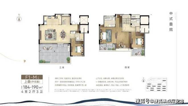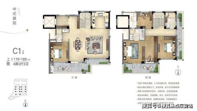 建筑面积约188㎡的上叠样板房,分三楼与四楼双层空间,整体采取了四房两厅三卫的设计,上下分区,实现生活场景的动静分离:餐客厅等社交娱乐空间均设在三层,四层则是卧室、书房等静谧空间,娱乐与休息互不干扰,为家人提供了更高品质的居住体验。