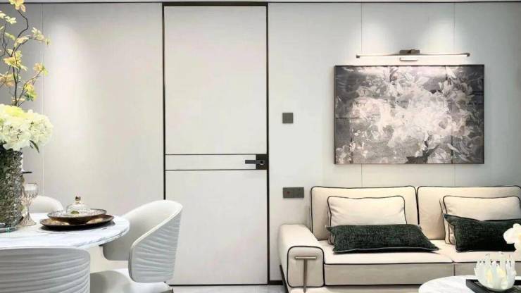 全屋一体化设计,率先使用全金属天地一体化包边设计。客厅无主灯设计搭配悬浮吊顶,同时将空调出风口一体化隐藏,而空调回风口则是与入户门吊顶完美融为一体。通过简洁的轻奢化精装,打造纯粹、整体感强的生活质感。