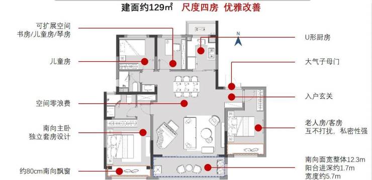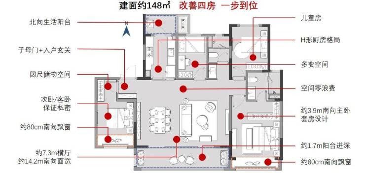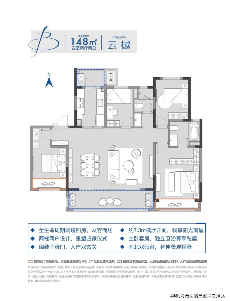 户型亮点:得房率高达79%,两梯两户配置,最大楼间距达72米,保障采光与私密性