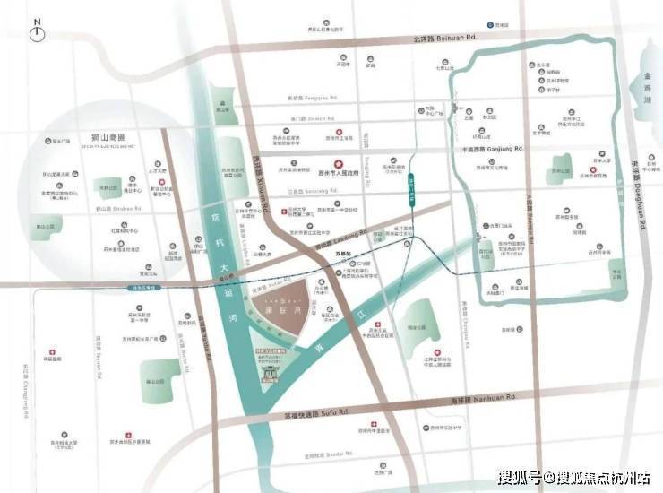生态 :社区内湖为生态核心,毗邻 京杭大运河 、 胥江 ,步行可达 劳动公园 (3500㎡),骑行10分钟直达 桐泾公园 (20万㎡)。