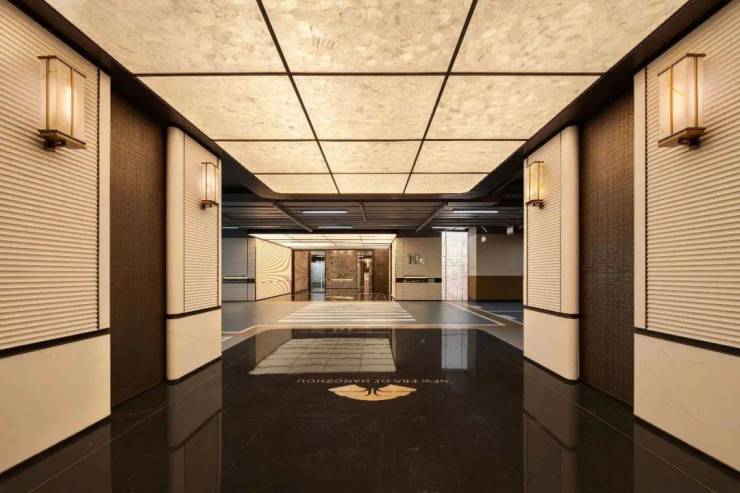 厅堂内大型水景艺术灯高悬于顶,以天为幕、气场大开,照映大理石地面,通体气派,传神东方宅邸的风骨。