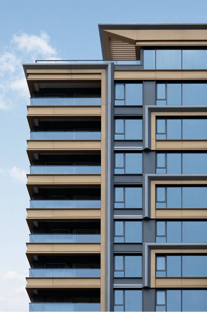 项目外立面由享誉国际的日清设计团队精心打造,大面积的玻璃幕墙与铝板、石材巧妙融合,斜切的线条与香槟色的金属点缀其间,构成了江河汇版图上极为靓丽的天际线。大面积幕墙、铝板、石材经“HARRY WINSTON”钻石打磨般切割工艺,营建如水奔涌的轻盈线条、大小各异的丰富立面形态,立标极简内敛的当代风尚。