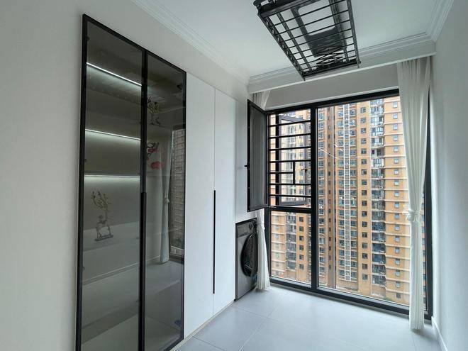 阳台的位置设计了柜子,辛辛苦苦换来的房子,半点空间没有浪费!在设计柜子的时候,预留了洗衣机的位置,非常有设计感。顶面位置给晾晒衣物,特别棒。