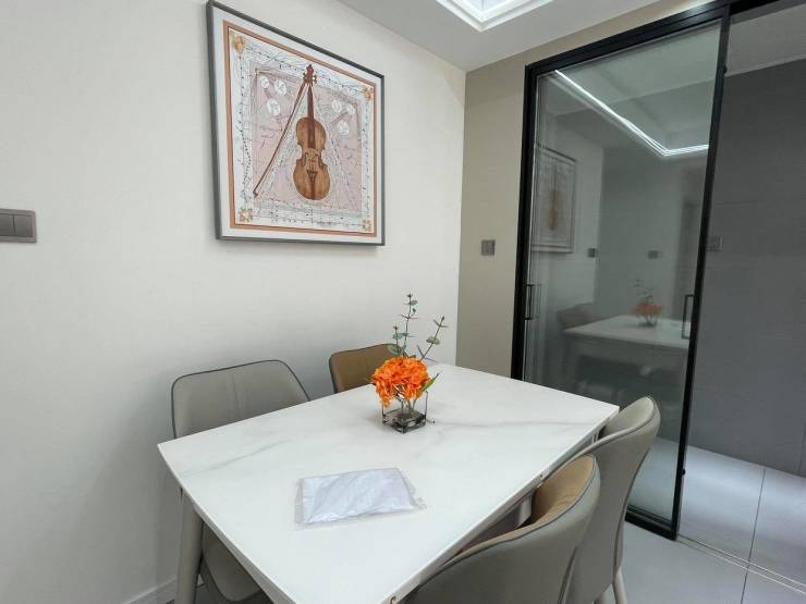 餐厅布置了一张长方形餐桌,占用的空间大小位置合适,人多需要用餐的时候,需要挪动位置会方便很多,特别令人满意。一般来说,年轻人都比较喜欢方形餐桌,还是比较合适的。可以试想一下,一家人坐在一起用餐的场景,真的是太幸福了!