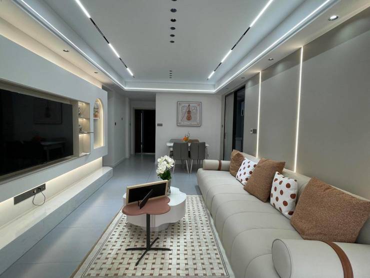 客厅跟阳台打通,增加来一些室内面积,长大了室内空间,还是蛮不错的。而且顶面选择了无主灯设计,也是年轻人比较喜欢的一种款式。无主灯给人的一种感觉,简单又好看,还很时尚。家里面如果你喜欢上这样的设计,非常值得推荐。同时安装了中央空调,使用非常方便!