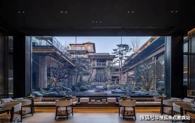 大尺度观景窗借景远山,竖向标高差强化仪式感,庭院中亭子的仰视视角塑造主峰山势巍峨之感。
