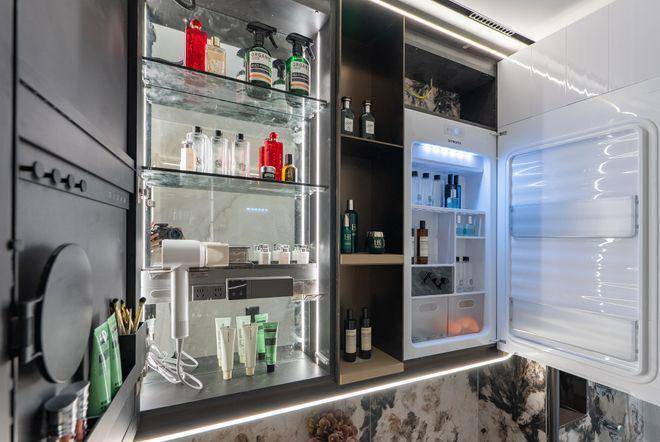 全系户型均以高规格品牌打底:100㎡户型标配嘉格纳3件套,137㎡户型升级为嘉格纳5件套(冰箱、蒸烤一体机、灶具、油烟机、洗碗机)——要知道,这类配置常出现在黄浦5000万级顶豪中。此外,唯宝马桶、铂浪高水槽等国际一线品牌覆盖全系,主卫更贴心增设美妆龙头与美妆冰箱,从日常烹饪到洗漱护肤,全方位提升居住品质。