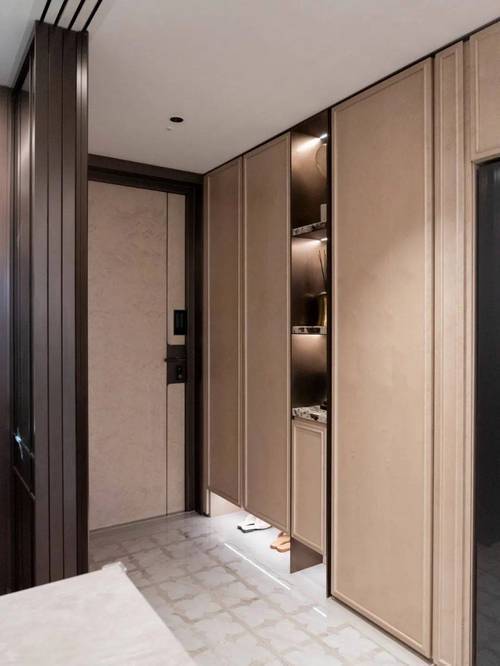 项目137㎡户型进门做了一整排收纳柜,分类科学到让每一件物品都能精准归位。