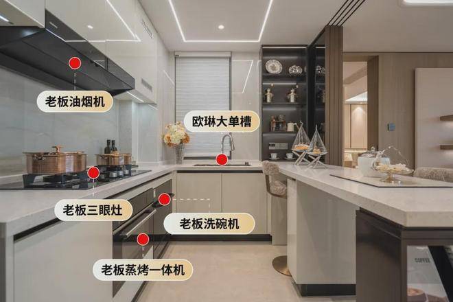厨房:老板油烟机、三眼灶、蒸烤一体机、洗碗机四件套齐全;欧琳的大单槽,方便锅具等大厨具清洗。