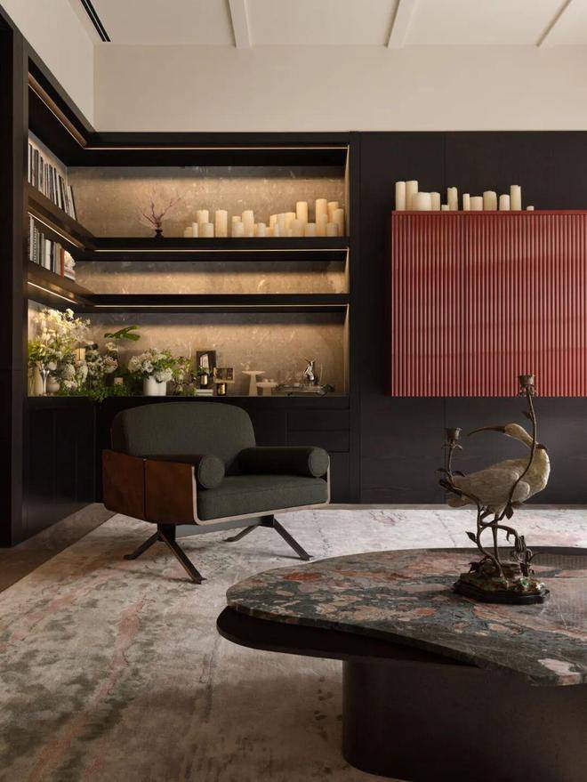 The guest room is designed to resemble a family study, where conversation is infused with warmth and a unique sense of belonging. The flexible, movable partitions between areas allow for dynamic space relationships. We aim for every guest to catch a glimpse of the future home: a study, a lounge, and a media room—each inspiring endless possibilities in life and sparking a fresh understanding of self and the essence of living.