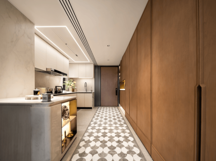 厨房方面,水波纹玻璃+金属造型玻璃移门,隐形上轨,厨房交付线性凉霸、末端饮水、博世或AEG(或同等品牌)烟灶、洗碗机三件套。