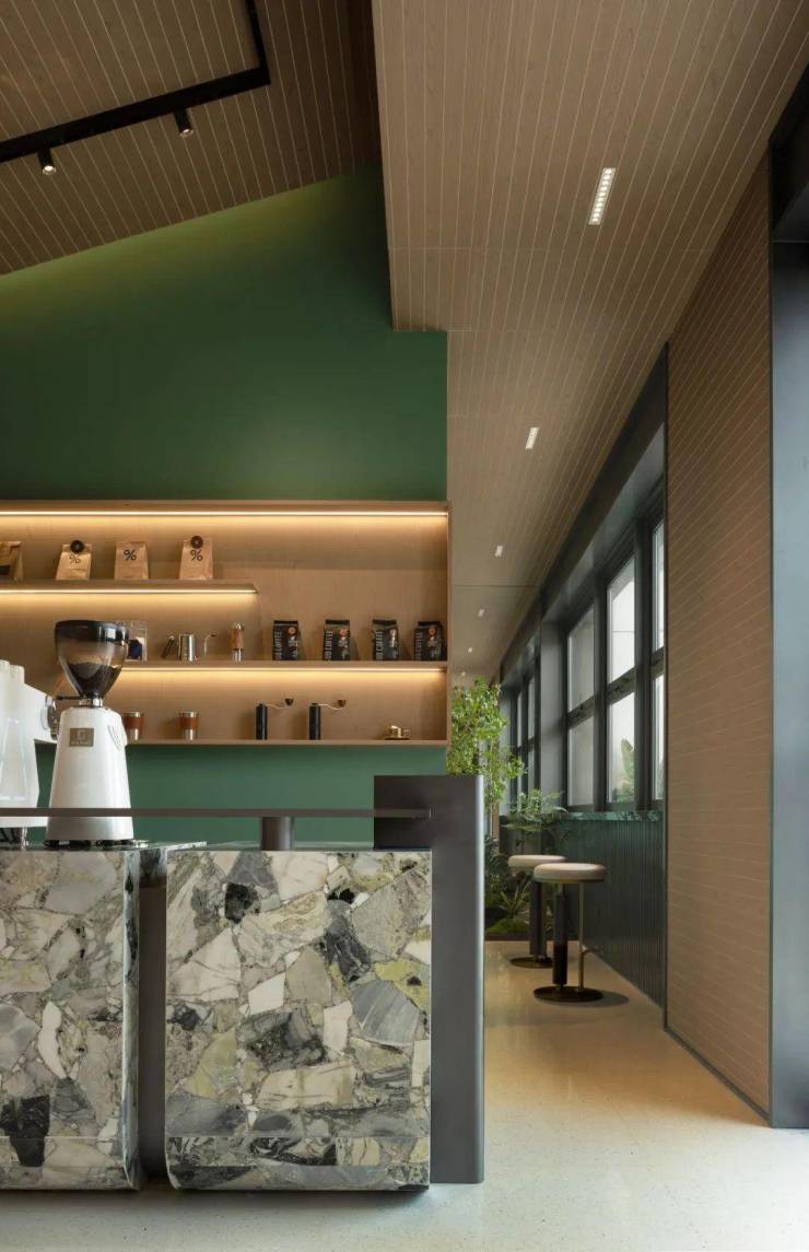 金色飘檐擦亮辨识度,南立面以大面玻璃主打,白、金、蓝灰为主调,配合部分涂料;基部用上了贝金米黄大理石,温润如月光。