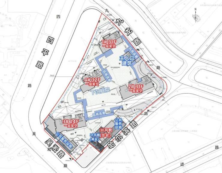 根据设计方案显示,项目拟建4幢24-31层高层住宅以及1幢总高3层的风貌建筑。
