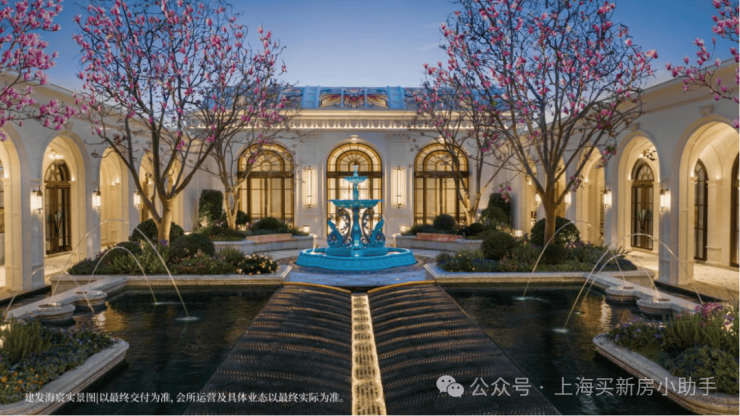 约65米环抱式落客前场,灵感源于“上海豫园-湖心亭九曲桥”,双尊威严铜狮静立、双株名贵金桂环抱一汪“尊华瑞鳞”水景,镇守家宅安宁,寓意流水生财。
