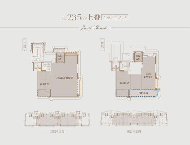 在建面约235㎡星宸上叠中,建发海宸着重强调一层一境的“四重院”生活动线,为三代同堂的中国式家庭提供了解决方案。