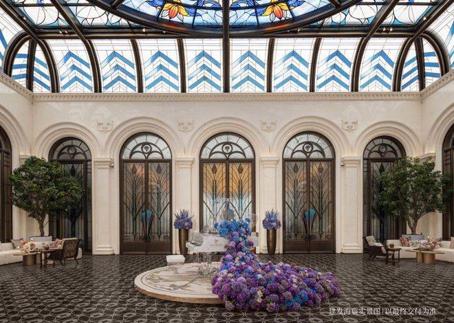 彩绘玻璃穹顶漫射柔和天光,艺术拱门与浮雕墙面交替排列,中央紫蓝渐变花艺装置描摹四季流转之美,可上演私享音乐会、业主演说会、亲子读书会、浪漫下午茶等,复现百年和平饭店的顶层社交场景。