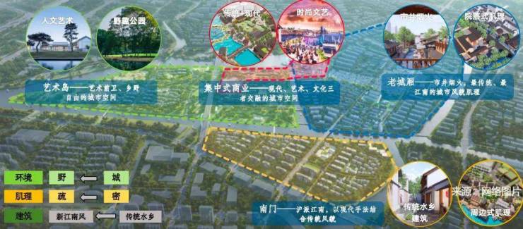 【园林】园林设计上依据“一轴两园 五进十景”规划,以豫园造景手法为基础,提取楼阁、折桥、墨池等中式元素,构建立体山水,重绘江南坊巷。