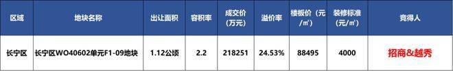 2024年第八批次土拍首日,招商&越秀以总价21.82亿元竞得长宁区仙霞社区地块(长宁区W040602单元F1-09地块)。溢价率24.54%拿下。折合楼板价88495元/㎡,装修标准4000/㎡。