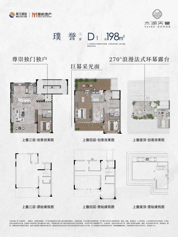 ·上叠270°法式环幕露台:抬头可见广袤天空,举目可望旖旎风光;下叠独享天地庭院: 一院盛纳四时流转,收藏天地间诗意栖居;