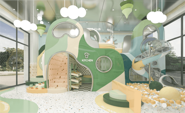 活力聚场,生长邻里温度:主题架空层被匠心转化为一座风雨无阻的“第二会客厅”,涵盖书咖、儿童游乐区等多元主题空间,全龄、全时、全维的功能交织,让邻里温情在此自然生发。