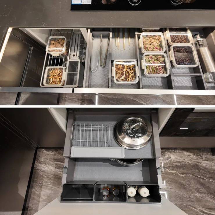 燃气灶下方做好分区的抽屉和轻松抽。台面边缘做了一定角度的斜切,这样即便滴水也不会漏至下方的柜体之中。