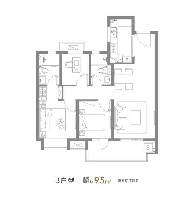 约95㎡的3房2厅2卫户型,这个户型的实用性太高了。能保证业主从二人世界到二胎家庭的全生命周期需求。