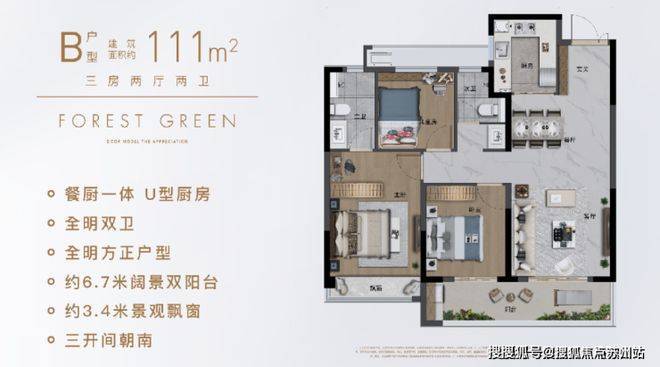 建面约89㎡三房:南向双飘窗设计,得房率82%