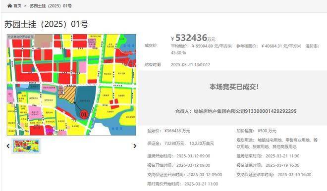 绿城凤起潮鸣,即,苏园土挂(2025)01号地块,位于工业园区东板桥河西、金鸡湖大道南,3月21日,绿城以总价532436万元竞得,成交楼面价40684元/平,溢价率45.3%。
