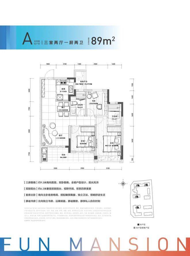 比如89方的中间套三房两卫户型采用了L形的大小双联阳台,既舒适又实用。105方的边套三房两卫户型,边厅的宽度达到了7.1米,南侧预留了放钢琴或者敞开式书房的位置。