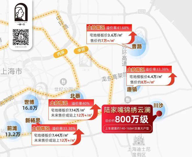 据最新土拍,曹路宅地溢价率高达41.68%,预计未来售价将突破7万+/㎡;而去年拿地的唐镇地块,溢价率同样高达约33.38%,售价已突破8万+/㎡。