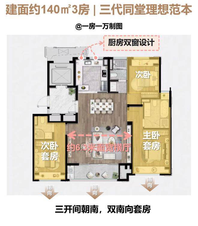 建面约140㎡户型,不仅仅是三开间朝南,更做到了双南向套房设计,以阳光为笔,勾勒出更尊崇、更有隐私性的休憩空间,充分满足当代居住需求。