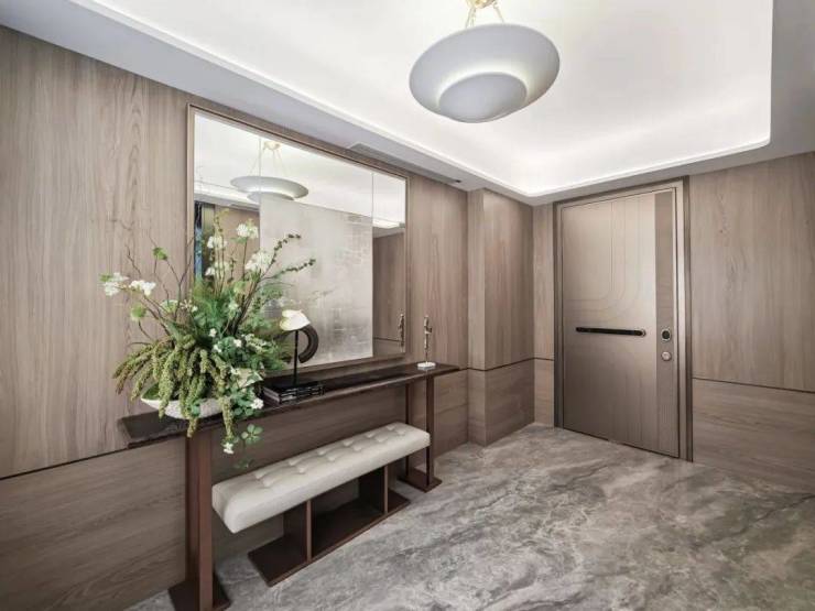 该户型外部呈类一梯一户设计,将近10㎡的电梯厅空间成为家的延伸,配合门内玄关形成内外双玄关格局,大幅度提升了居家的私密性和仪式感。
