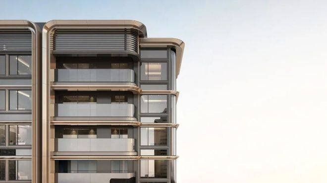 尤安团队设计的海派现代风外立面呈现超高辨识度!经典三段式设计,蓝灰色玻璃、仿铜色铝板、深色石材搭配圆弧倒角收边,用料昂贵奢华、质感无敌!