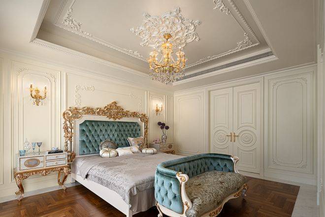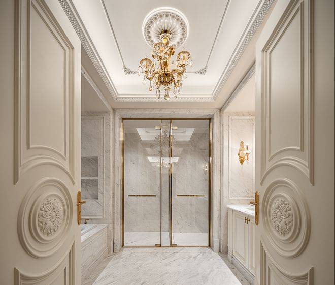 衣帽间通过对称布局与精致雕花细节,强化法式轻奢的仪式感,同时满足大容量储物需求。