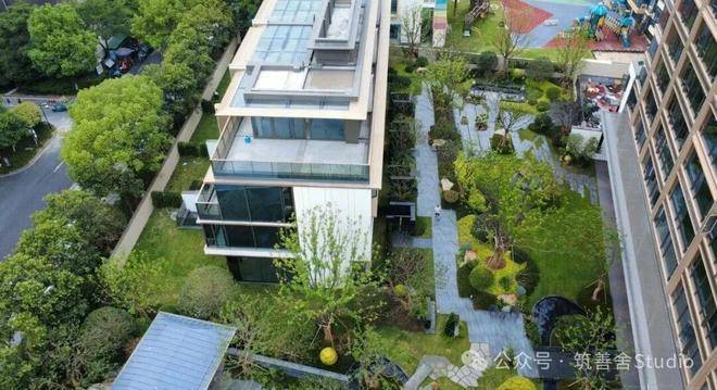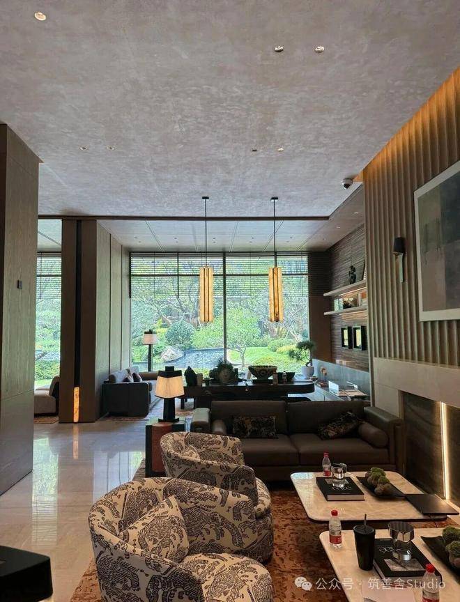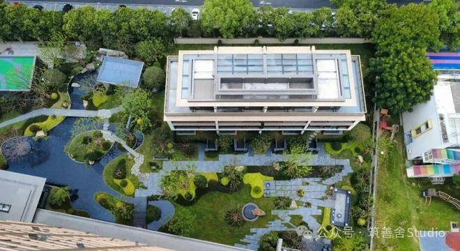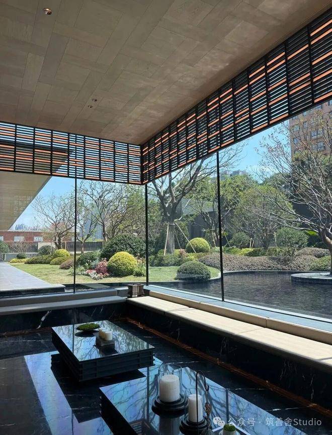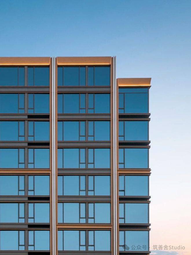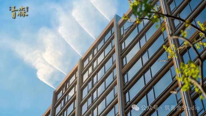 建筑外立面采用全铝板环绕四周,大尺度玻璃点缀其间,构筑出对称中蕴含韵律变化的立面,呈现出独具一格的森系设计。在光影的交织流转中,为空间注入优雅的生命力,与森系园林完美融合,相映成趣。