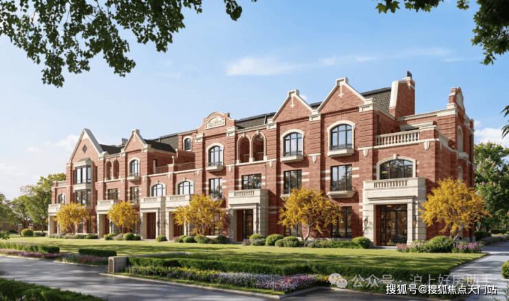 联排别墅采用英式维多利亚建筑风格,红砖与德国米黄干挂石材的搭配,形成温暖且经典的色调;经典长窗/方框窗/八角窗/拱形造型/坡屋面,赋予建筑精巧自然的美学质感。