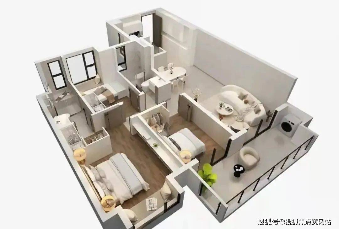 本次推出的106㎡户型,打造了3房2厅2卫的高利用率空间,3开间朝南设计,同时拥有阔景连通式双阳台、套房式主卧、L型厨房,在满足功能使用的基础上兼具空间尺度的舒适感。合理利用了每一寸空间,实现采光和观景效果的较大化。